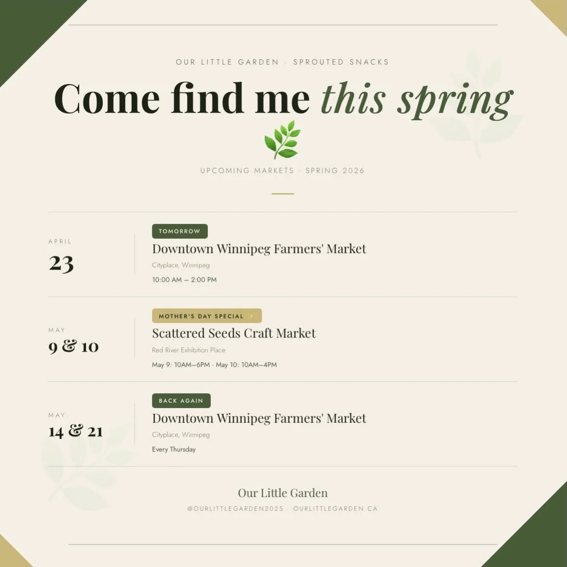 We're a small-batch sprouted snack brand made right here in Winnipeg. The best way to experience Our Little Garden is in person โ taste, ask questions, and take home a bag (or three).